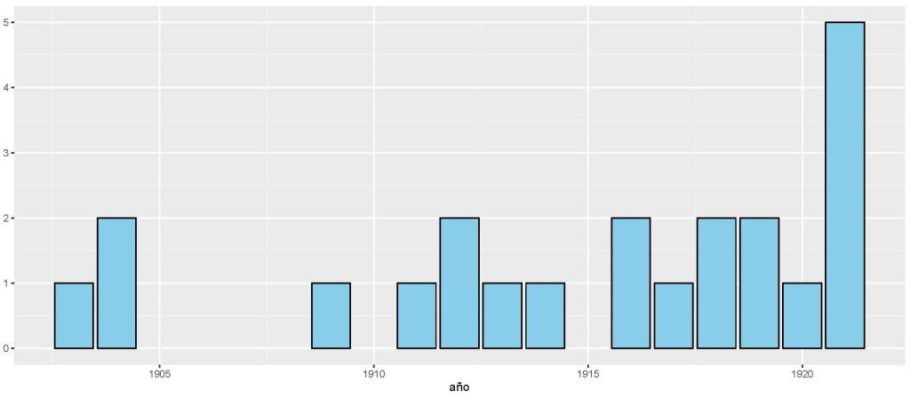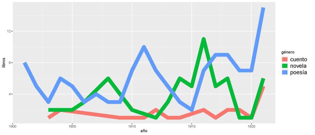 Una de las ventajas de un enfoque cuantitativo es que permite mostrar evidencia. No es lo mismo escribir “la poesía fue el género más popular a inicios del siglo XX” que poner “la poesía representó el 60% de los textos literarios hasta 1921”. Y si esa evidencia se puede graficar, mucho mejor. ¿Alguien discutiría la popularidad poética después de ver esta imagen?